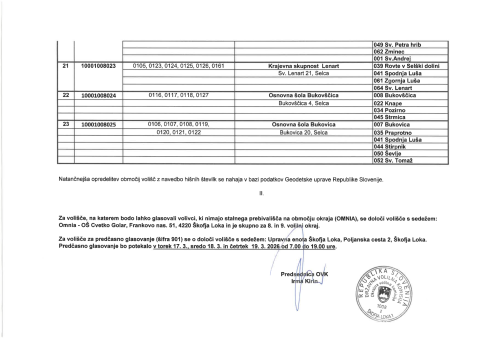 obveščamo vas, da nas je OVK obvestila, da (v skladu s sprejetim Sklepom o določitvi volišč za izvedbo rednih volitev v državni zbor, ki bodo, na podlagi odloka o razpisu rednih volitev v državni zbor izpeljane naslednjo nedeljo 22. marca 2026) lokacija volišča št. 20 ostaja lokacija v prostorih gostilne Pri Kajbitu, Zminec 5, Škofja Loka.