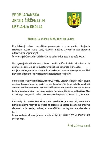 Hkrati vas obveščamo, da je z namenom zmanjševanja erozijske in poplavne ogroženosti prebivalcev, objektov, premoženja in zemljišč, prepovedano odlaganje vejevja, lesne mase oziroma kakršnokoli deponiranje lesa na vodnem in priobalnem zemljišču.
