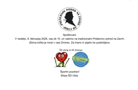 Spoštovane krajanke in spoštovani krajani, to nedeljo, 8. februarja 2026 Športno društvo Utrip vabi na tradicionalni Prešernov pohod na Zavrh. Zbirna točka bo pri mostu v Zmincu, ob 10. uri. Za hrano in pijačo na Zavrhu bo poskrbljeno.